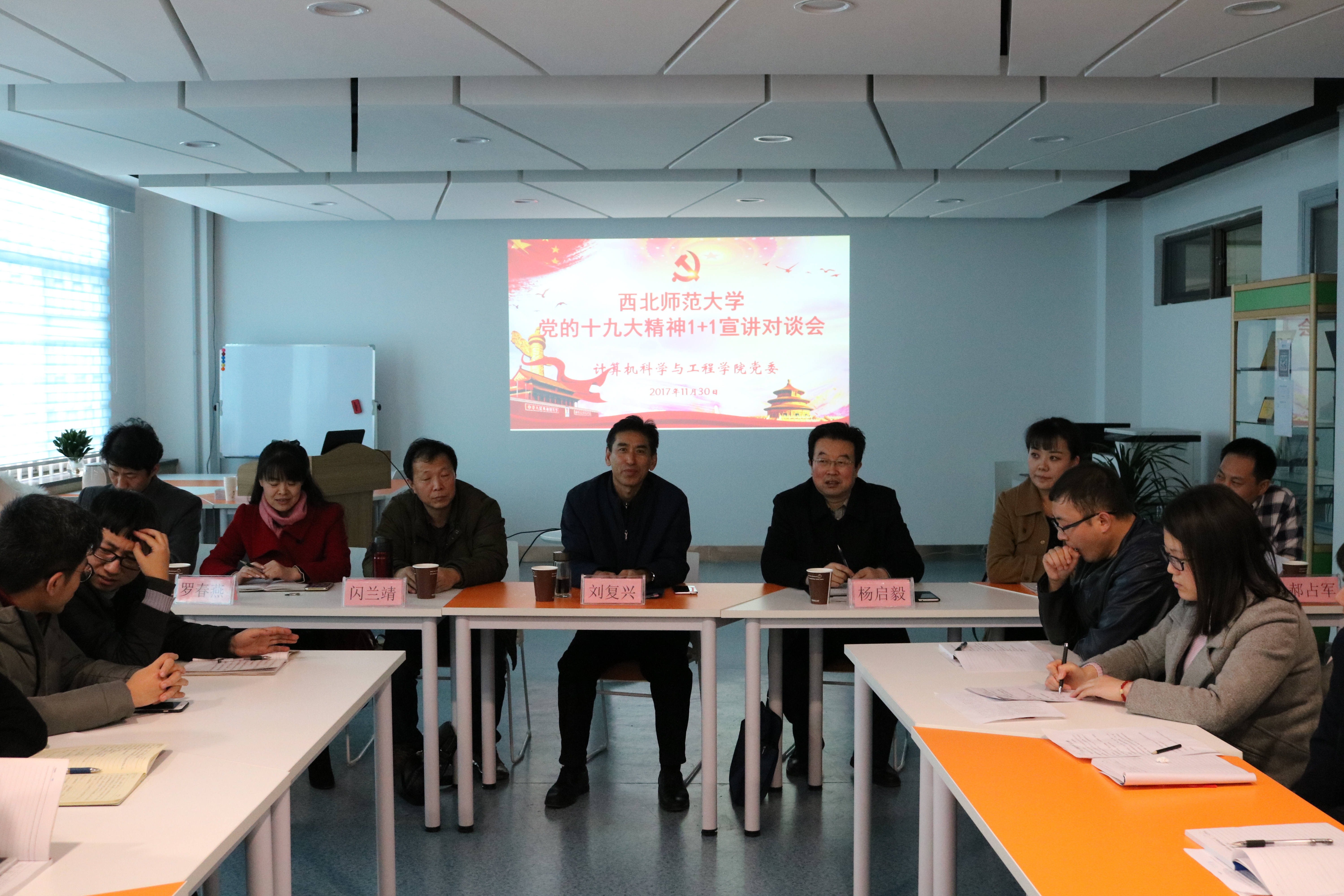 11月30日下午3点,公司党委“1+1”宣讲对谈小组的两位成员,公司党委常委、副董事长刘复兴教授和政治理论课教师、马克思主义学院闪兰靖副教授,走进365英国上市员工党支部,集中宣讲党的十九大精神,并与员工开展了对谈交流。公司党委书记杨启毅主持,员工党支部书记、本科生、研究生支部党员近70人参加了对谈活动。